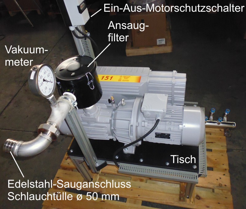 Bild 3: Ölgeschmierte Vakuumpumpe LC.151, 3,3 kW, montiert auf einem Tisch aus Aluminium-Profilen und einer Platte aus HDPE. Mit Ansaugfilter, Vakuummeter ø 100 mm und Sauganschluss aus Edelstahl, mit Stromversorgung.