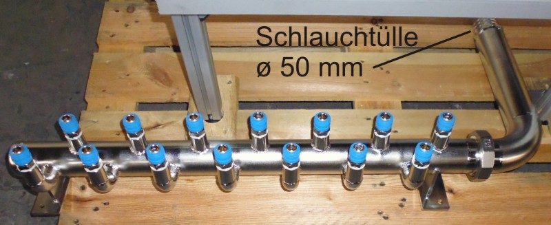 Bild 4: Zur Vakuumpumpe LC.151 zugehöriges Vakuum-Sammelrohr mit 14 Stück Steckkupplungs-Anschlüssen, aus Edelstahl, vorbereitet für die Wandmontage.