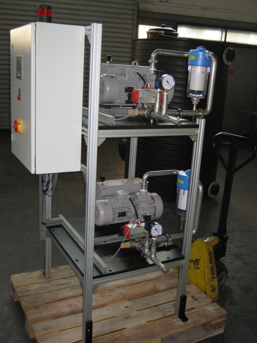 Bild 1: Vakuumanlage mit zwei ölgeschmierten Vakuumpumpen (je 40 m3/h), pneumatischen Kugelhähnen, Filtern und elektrischer Steuerung mit Druck-Messumformern. Die Verrohrung ist aus Edelstahl. Diese Anlage wird eingesetzt, um Karbonfaser-Bauteile beim Wasserstrahlschneiden festzuhalten.