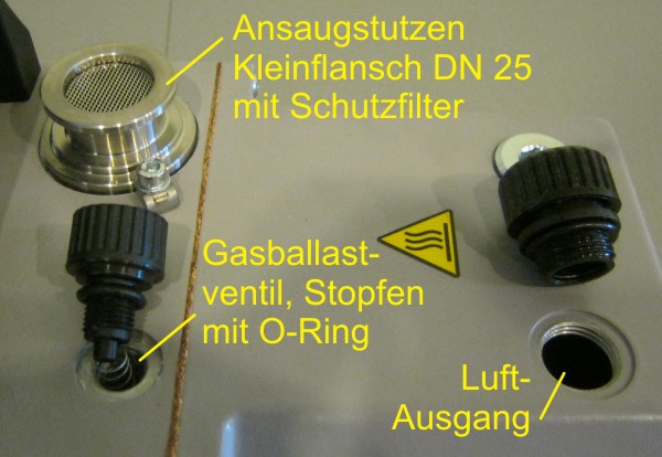 Foto 3: Details der Stutzen der ölgedichteten Vakuumpumpe DC.4D. Die Stopfen des Gasballastventils und des Luft-Ausgangs sind herausgeschraubt. Das Gasballastventil kann bei Bedarf geöffnet oder verschlossen werden. Am Luft-Ausgang kann bei Bedarf ein Abluftfilter angeschlossen werden.