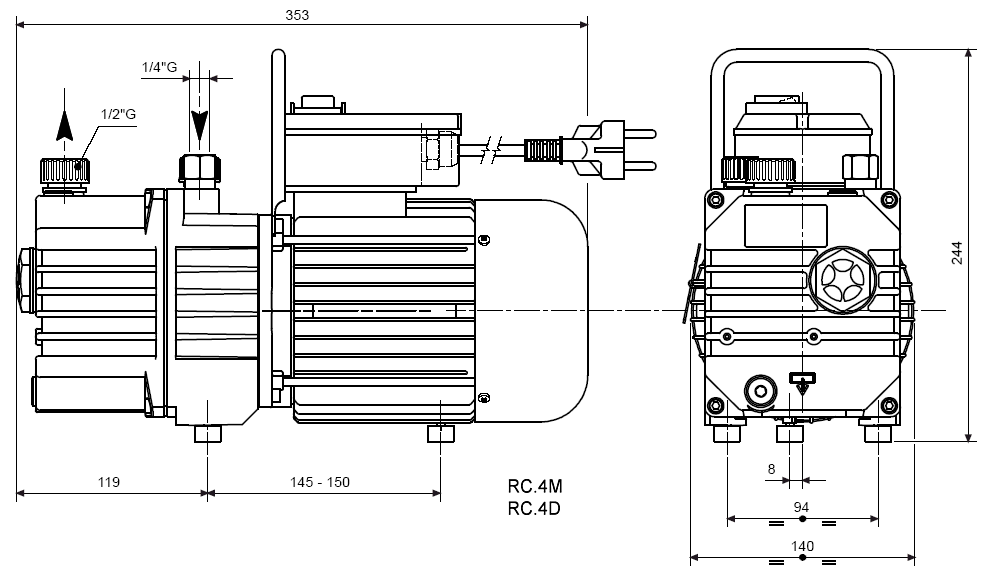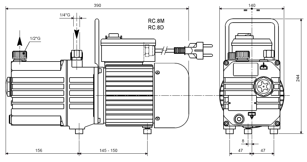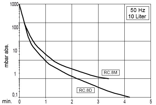 Beispiel aus der Klimatechnik: Die Vakuumpumpe RC.8M wird dazu eingesetzt, den Kältemittel-Kreislauf einer zuvor entleerten Klimaanlage zu evakuieren, bevor wieder neues Kältemittel eingefüllt werden kann. Die Vakuumpumpe entfernt Luft und störendes Wasser aus dem Leitungssystem. Während des Vakuumbetriebs über etwa 30 Minuten verdampfen auch kleine Wassertropfen bei normaler Raumtemperatur. Würde Luft und Feuchtigkeit nicht vollständig aus dem Kältemittel-Kreislauf entfernt, käme es später zu Schäden an der Klimaanlage. Manche Anwender bevorzugen für diesen Zweck eine noch stärkere, zweistufige ölgedichtete Vakuumpumpe, z.B. unser Modell DC.16D.